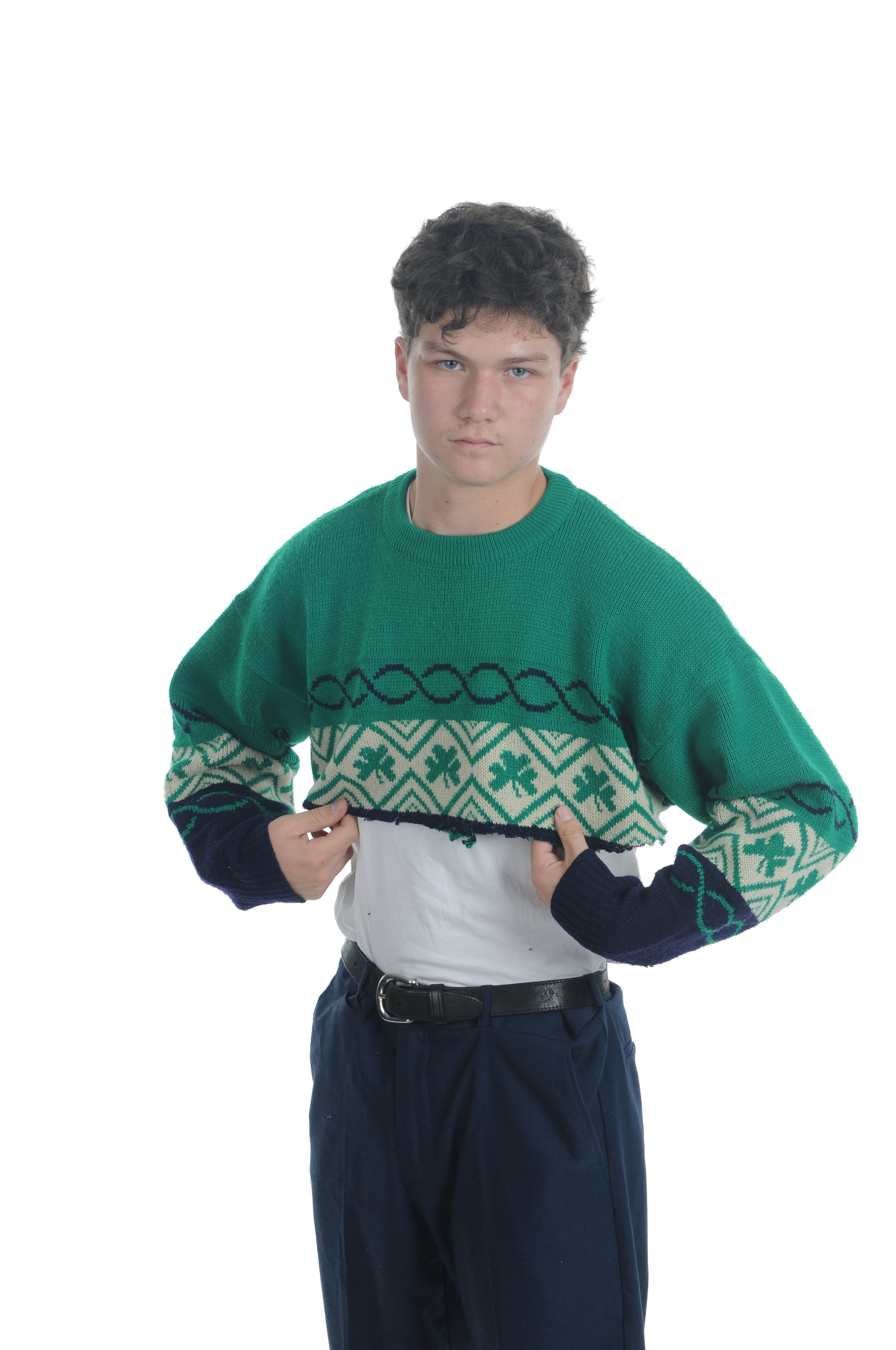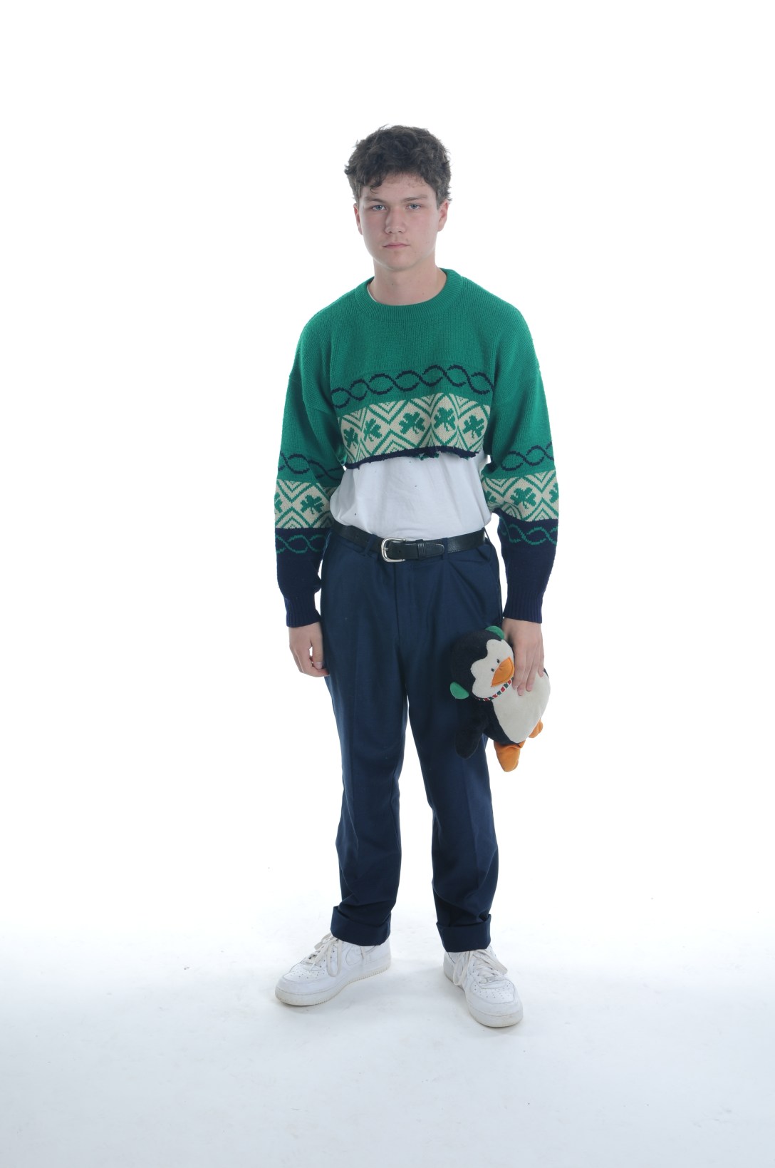 I screen printed one of my own drawings onto the back of this striped blazer that I found in an op shop. I chose to print it in the bright red so it would strongly contrast the blue stripes of the jacket.